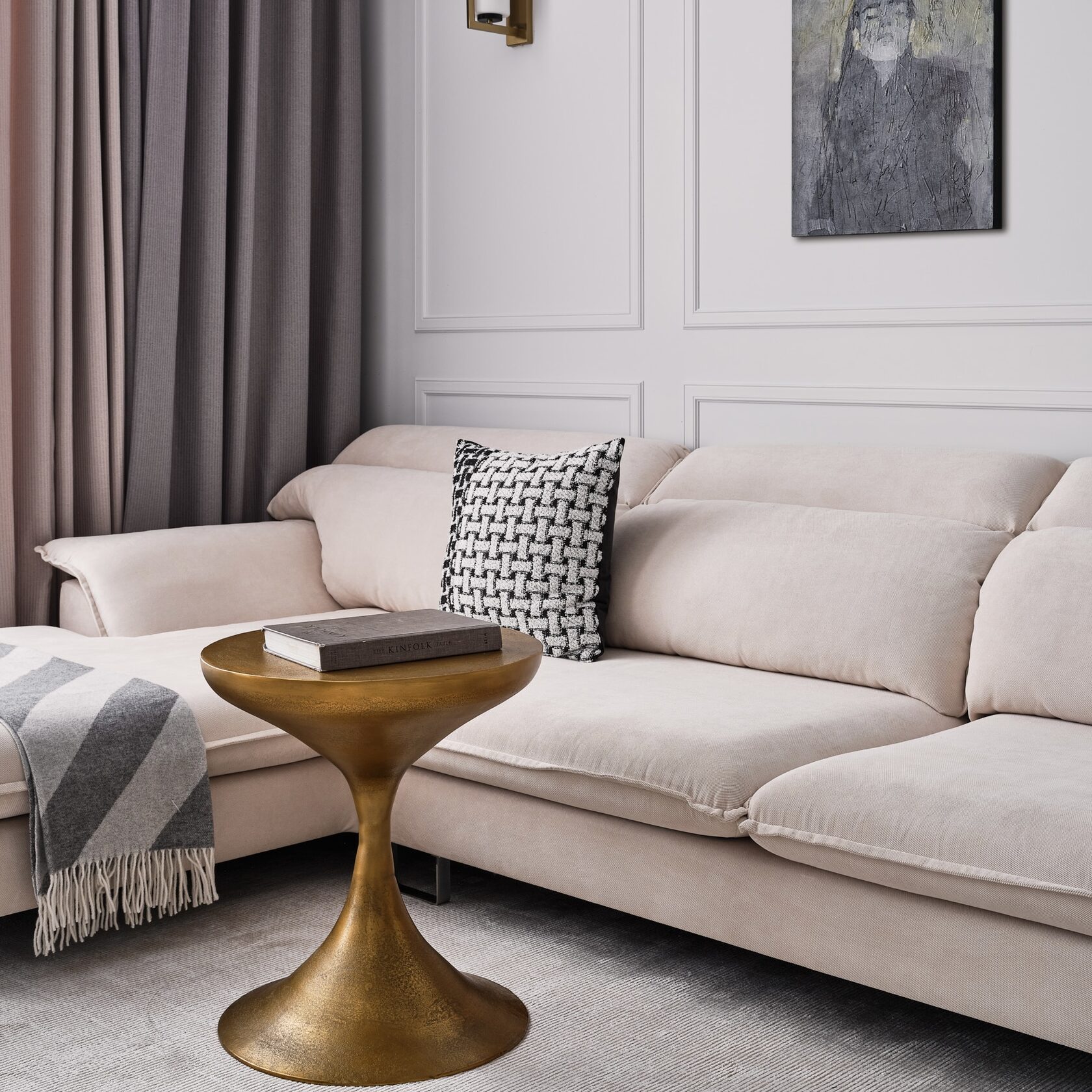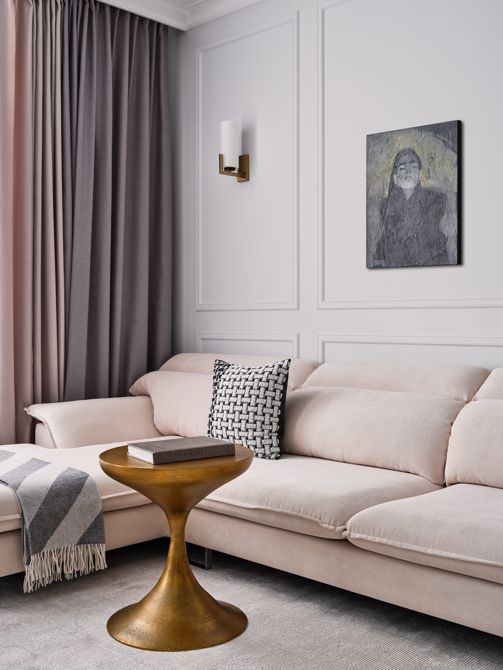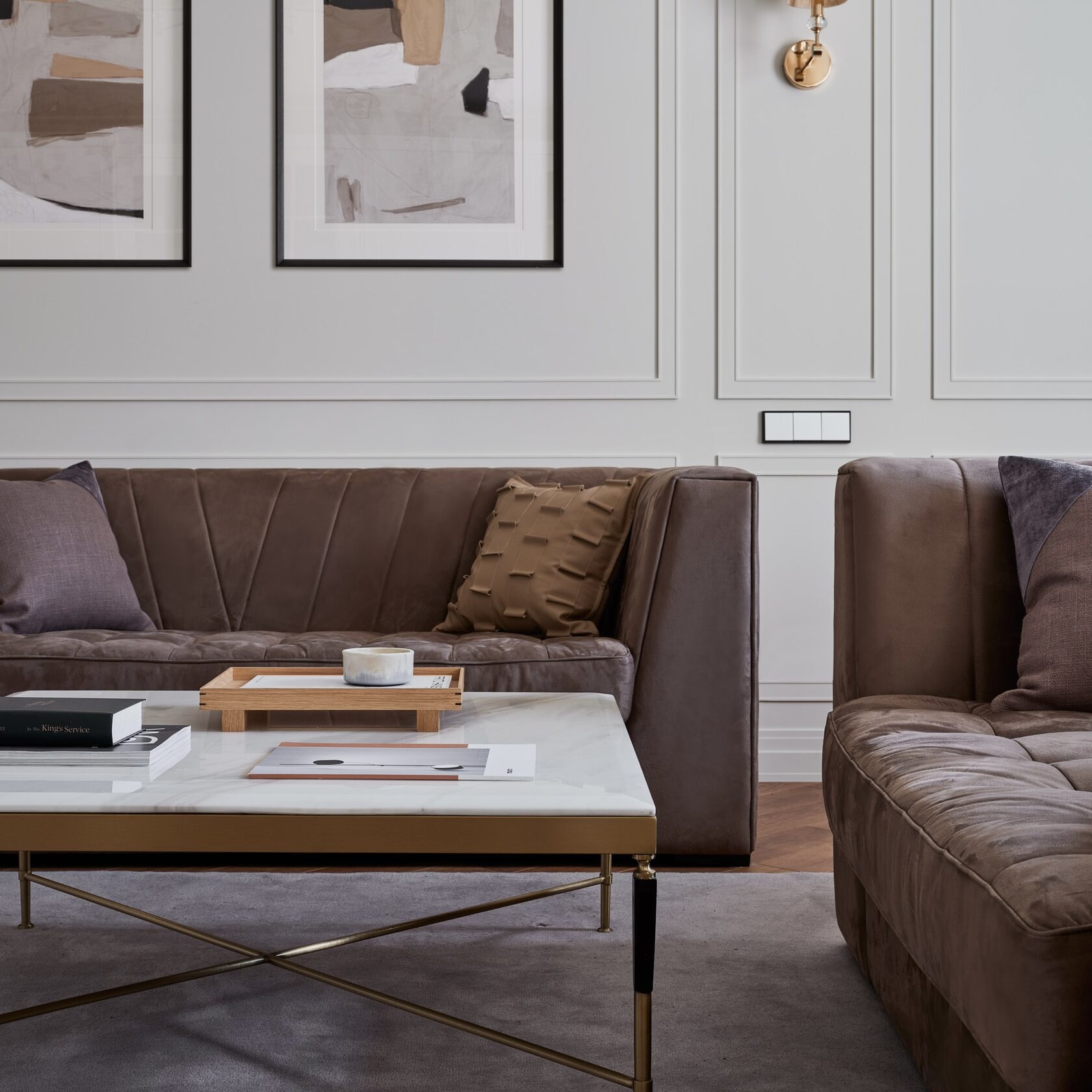 удры и золота в мебели и декоре сочетаются с крупными монохромными элементами отделки,