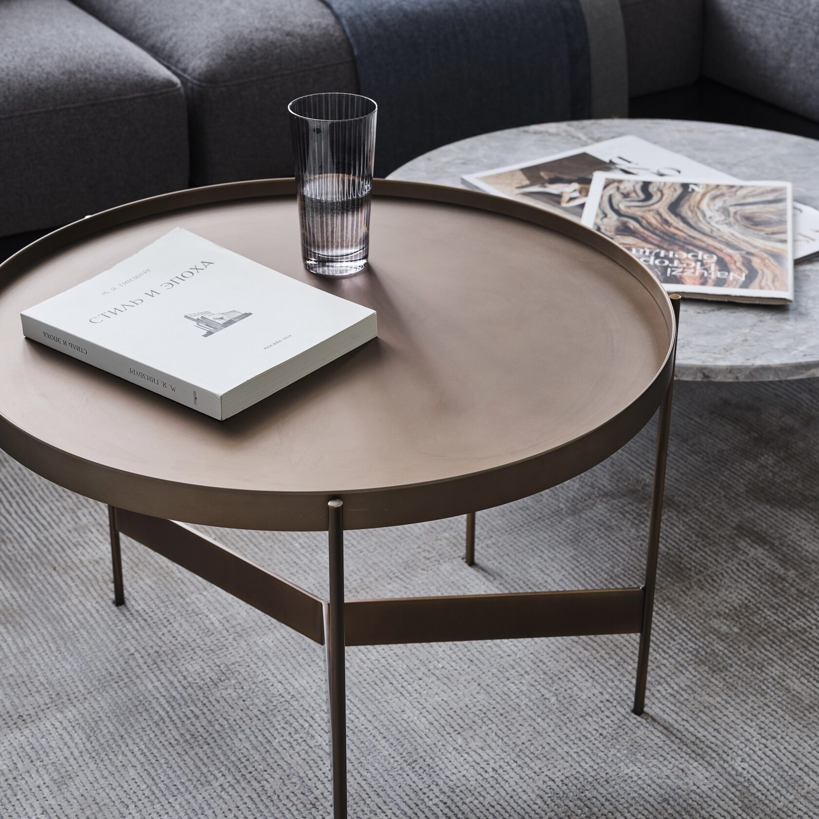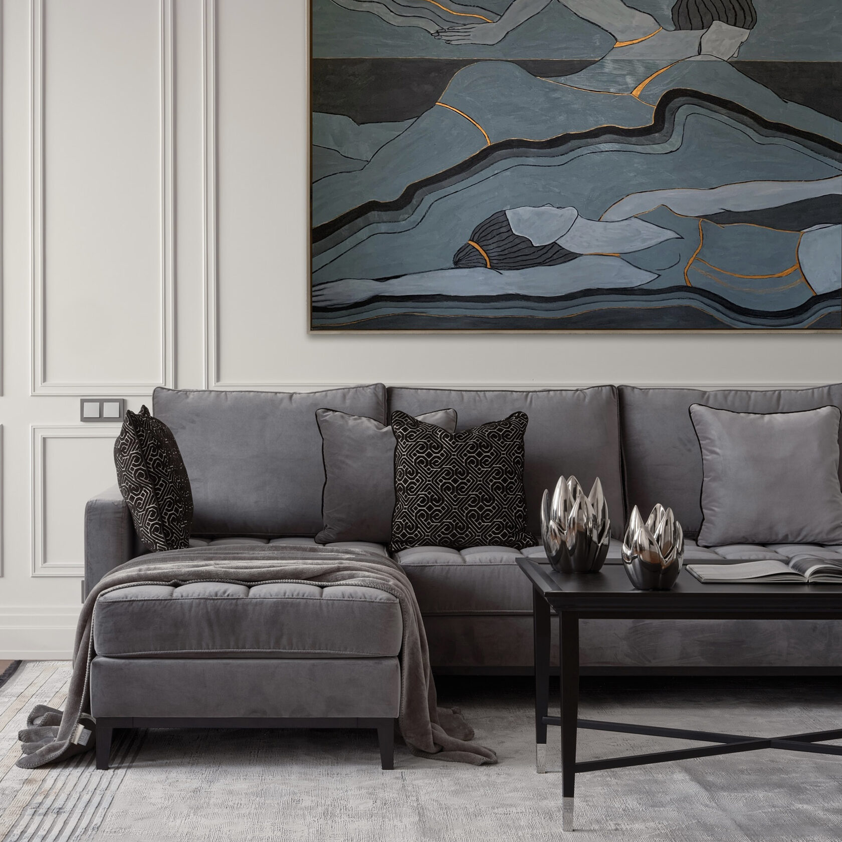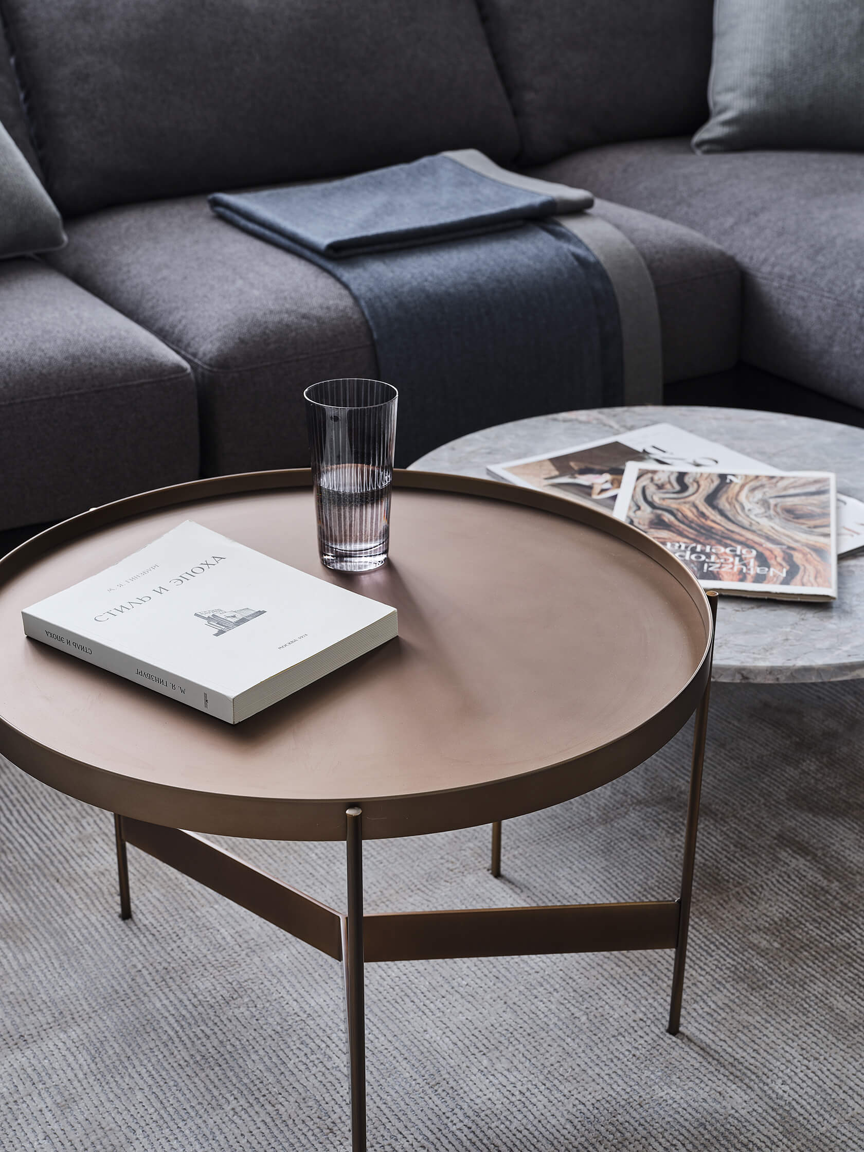 удры и золота в мебели и декоре сочетаются с крупными монохромными элементами отделки,