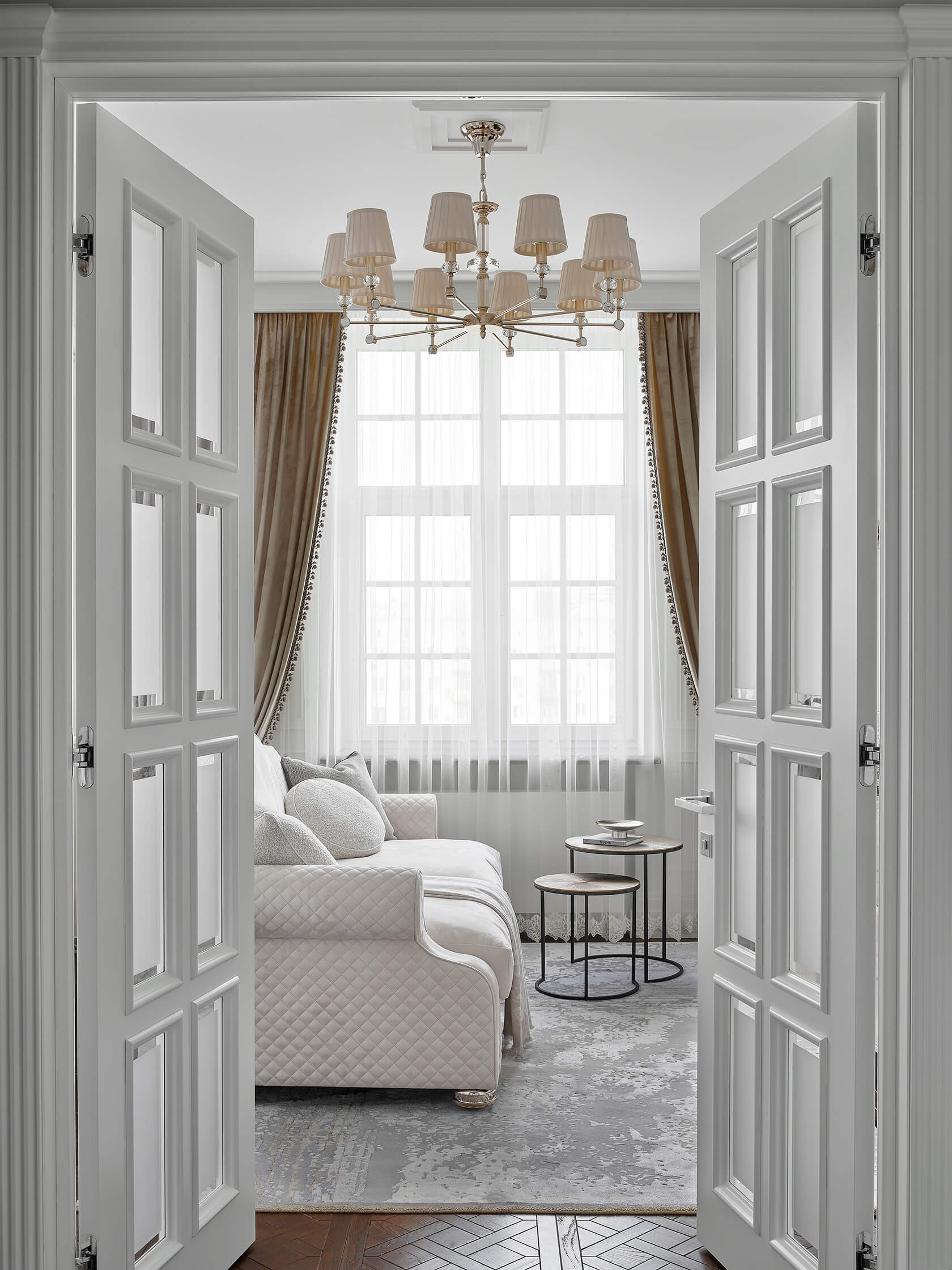 Отдавая дань сдержанности и аристократизму, мы аккуратно вплетали в обстановку изящные кованые элементы и хрусталь для создания поистине волшебного и праздничного интерьера