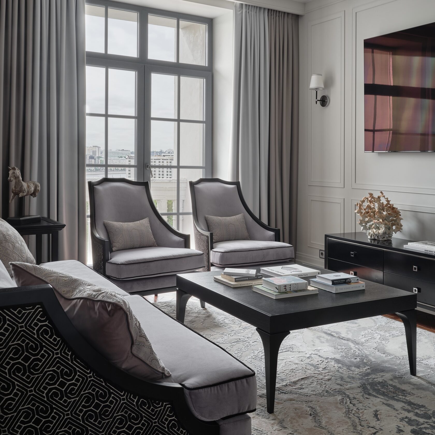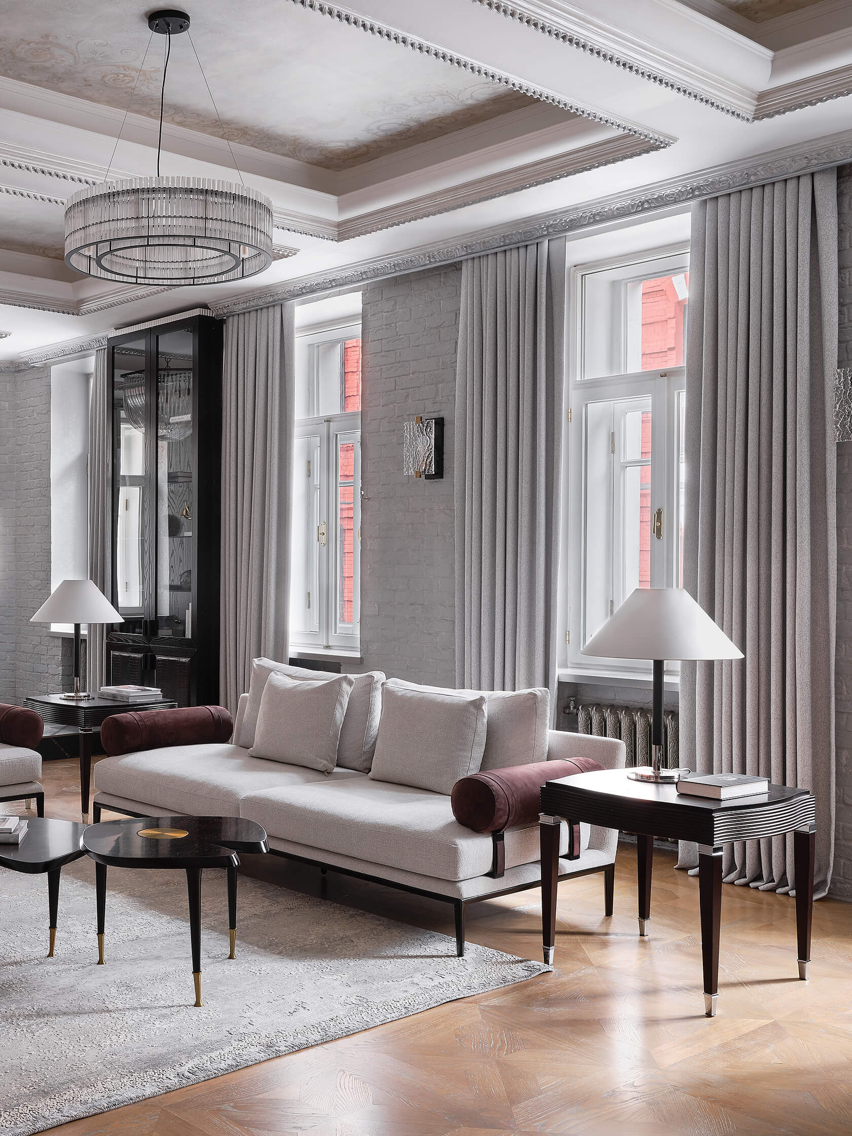 в стиле неоклассики сочетаются мягкость уникальных текстильных материалов и строгость минималистичной отделки. В отдельных помещениях сделаны акценты на оригинальных дизайнерских предметах декора и мебели