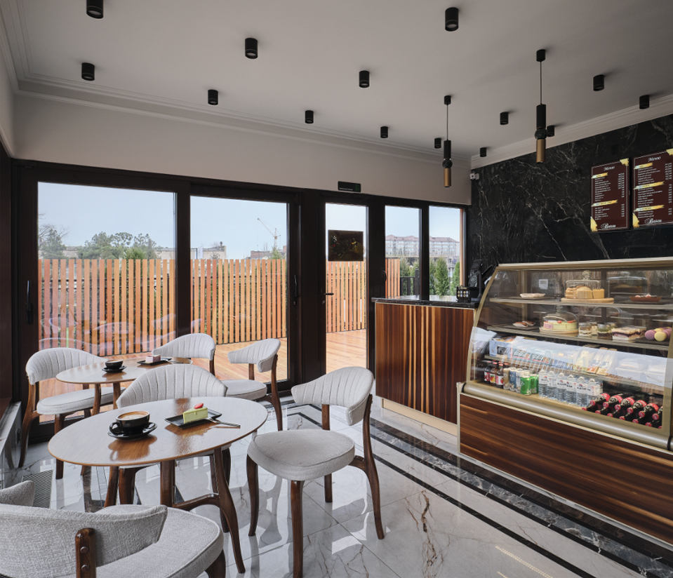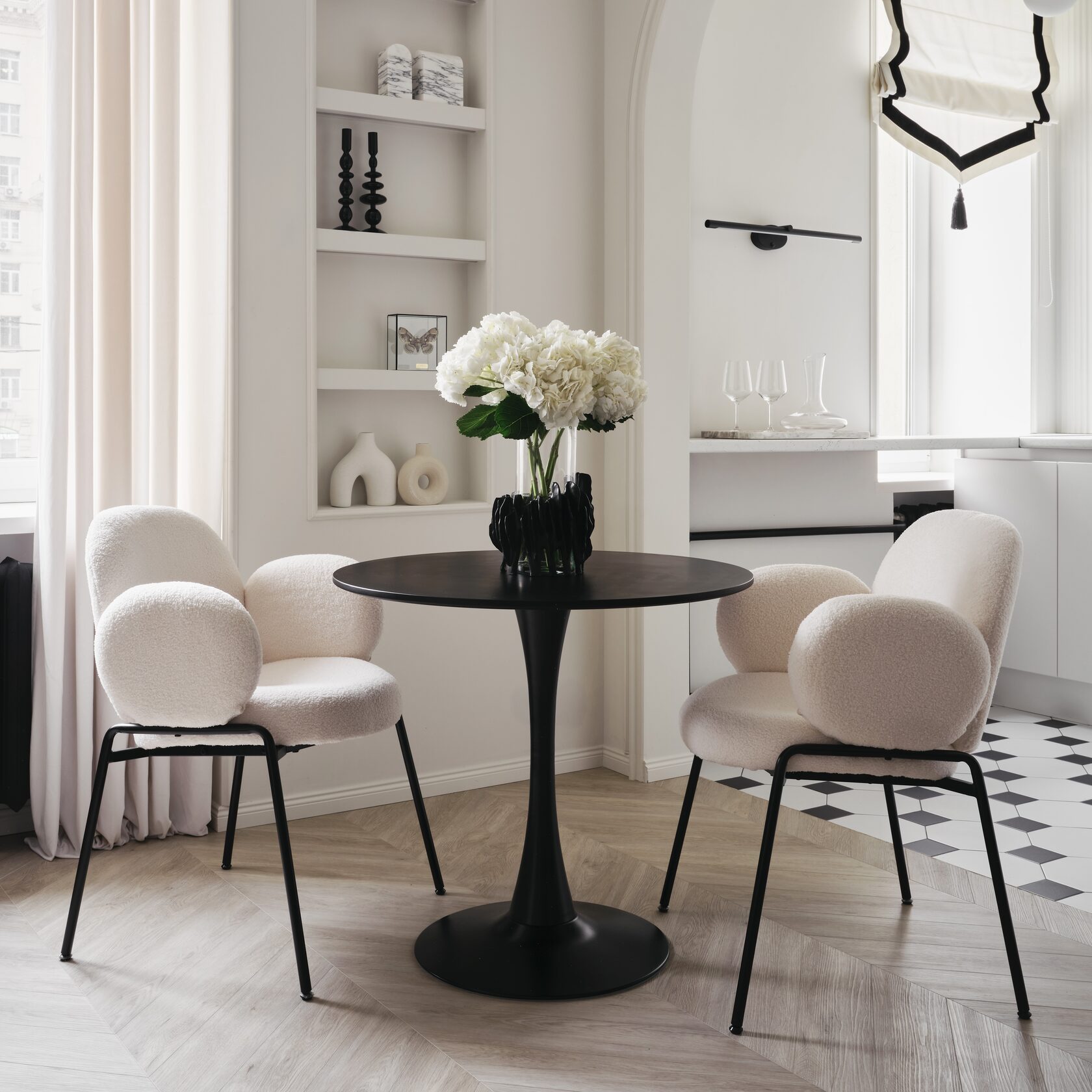 окна наполняют зал светом, подчеркивая совершенство линий и продуманность в деталях. Минимализм сочетается с теплом уюта, а простота форм — с изысканностью, создавая идеальный баланс между классикой и современным стилем